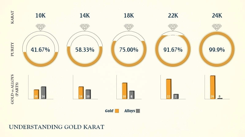 14K金的比例為58%黃金再搭配其他元素銀、銅、鎳、鈀等組合而成。14k金硬度更高而且保有黃金漂亮的顏色,也不會生鏽,光澤度佳,可以鑲嵌各式各樣寶石,最重要的是比18K和24K價格便宜許多,所以大量用於平常日常配戴的時尚飾品,保值性相對較低。