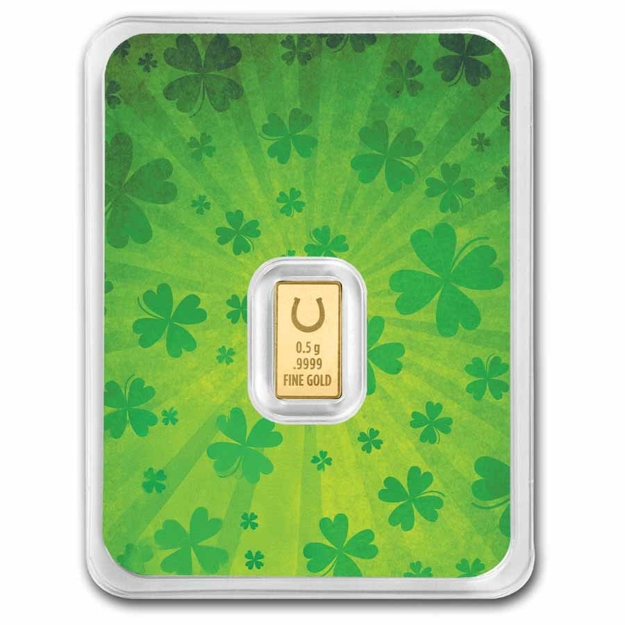 這款金條含有0.5克純度為99.99%的黃金,採用密封防竄改包裝,包裝上印有綠色幸運四葉草圖案,是贈與需要好運之人的絕佳禮物!