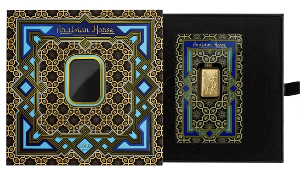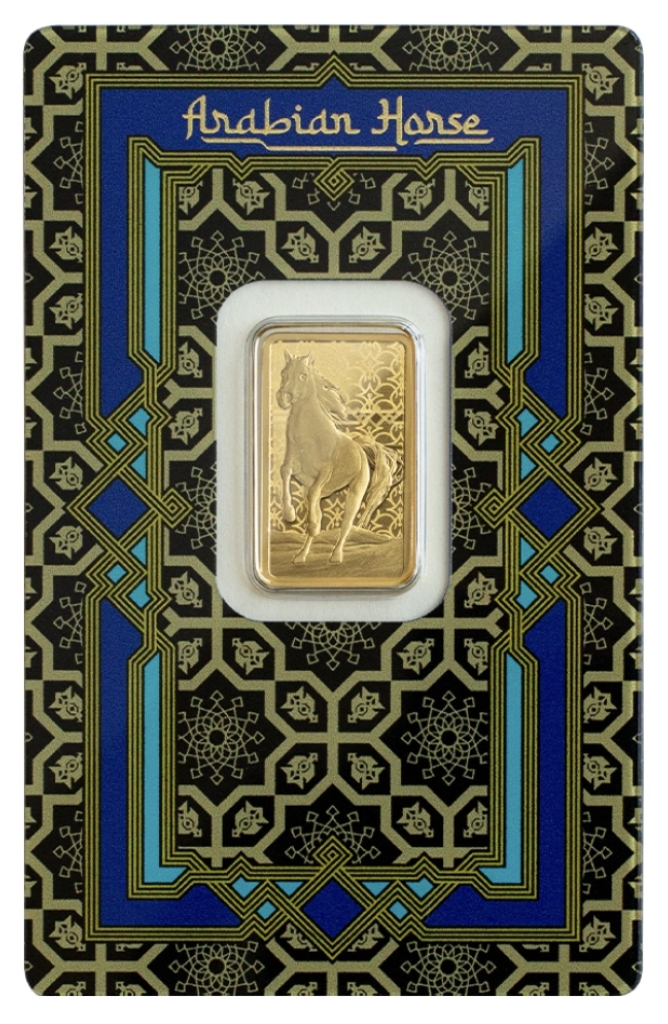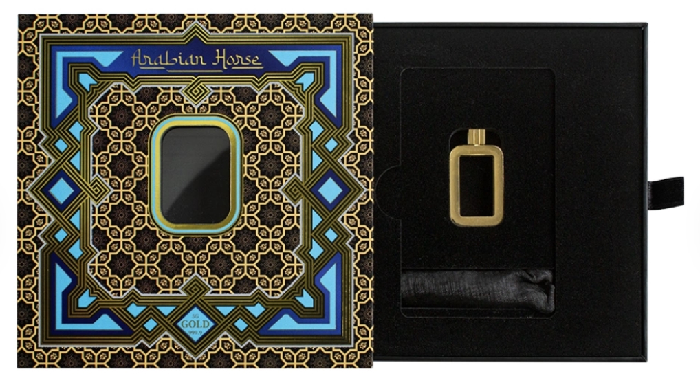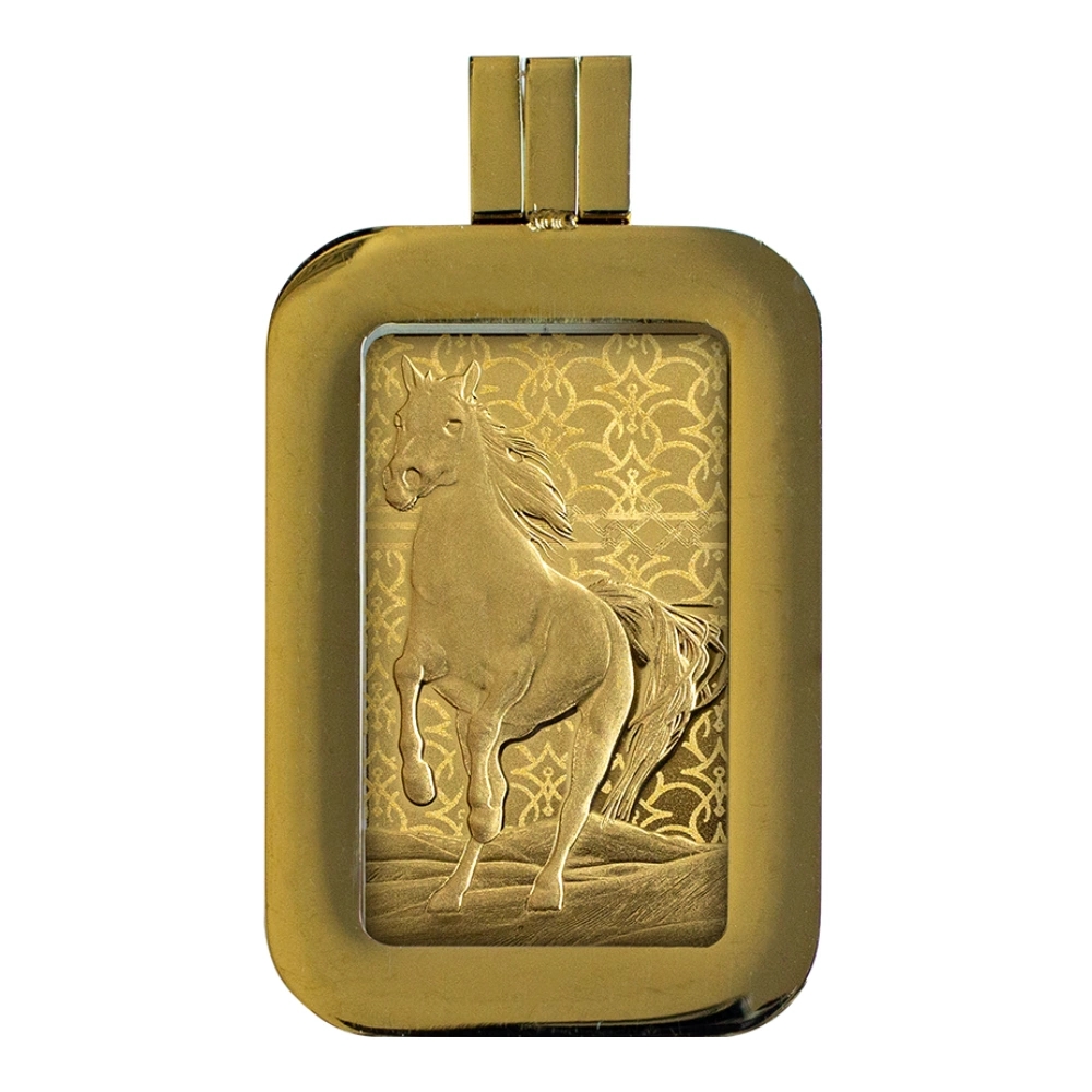 阿拉伯馬,被譽為世界上最具辨識度的馬種之一。這馬種源於阿拉伯半島,其古老而傳奇的歷史中,滿佈各種神奇的傳說。人們普遍相信,它最早於公元7世紀被馴化。這匹馬以其獨特的頭部結構和高揚的尾巴著稱,不僅因其驚人的速度和超群的耐力而被世人珍視,更因其優雅的外觀和智慧的天賦而倍受喜愛。為了紀念這馬種光輝的傳說,特地於這5公克的999.9純金條上刻畫其形象,更搭配了金色的不鏽鋼框,讓你可以將其佩戴成為一件矚目的墜飾。